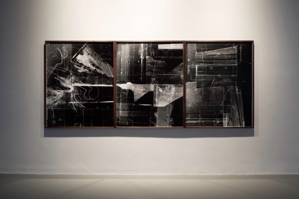 Sibungu’s and Leahy’s artworks contrast the films with photographic imagery. These pieces contribute greatly to the atmosphere of the exhibition, conveying a dark presence that looms over the spectators and suffuses the gallery. Sibungu’s artworks are large-scale photograms: images produced by placing physical objects onto photographic material and exposing them to light. Menacing and compelling in equal measure, these negatives belong to a wider project called Quantum Ghost that is primarily concerned with the consequences of British imperialism in Namibia, a republic in southern Africa. The artist discovered objects in the National Archives of Namibia that were used during the colonial era to mine precious minerals, and these form the starting point for her arresting artworks.