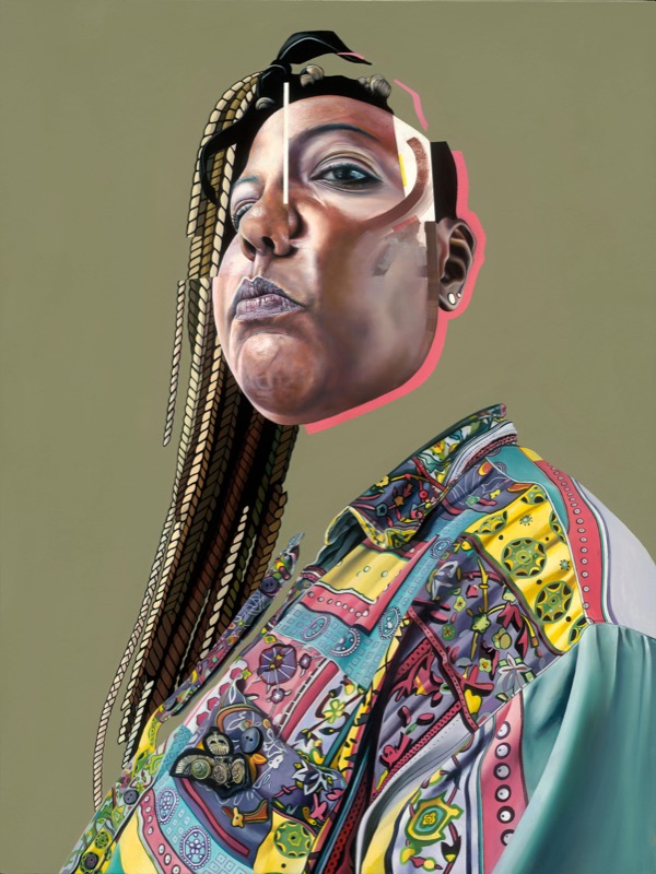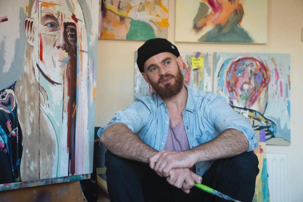 David Booth’s new show at Hang Tough Contemporary, Polybond, steers our fascination with the face into a surreal and futuristic territory. Booth is a young painter, a graduate of the Gorey School of Art, and one of a number of emerging artists – including Salvatore of Lucan and Alison Farrelly – with close ties to La Catedral Studios on St Augustine Street. He has a flair for capturing the fleshy, heavy muscularity and dewy weight of the sitter’s face, which forms a basis on which his graphic abstraction can run wild. In his realist vein, Booth’s use of oil-paint and his style of facial caricature and colour palette are reminiscent of avant-garde 20th century British portrait painters like Stanley Spencer and Lucien Freud, and, in this century, Tai Shan Schierenberg. That said, according to Booth, his major inspirations are Chuck Close and Jenny Saville. Their influence is certainly visible in his work, not least insofar as they are both experimental artists that focus on portraiture.