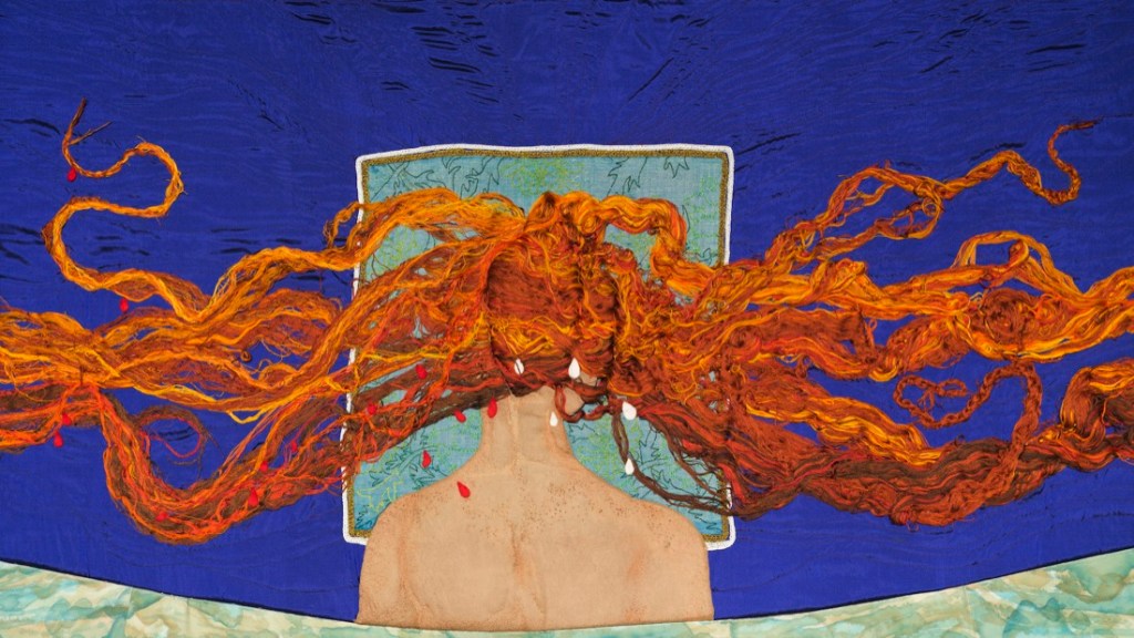 This room is a necessity, because The Map demands your undivided attention. It is a hybrid artwork, equal parts tapestry, sculpture and mural. Maher and Fallon’s piece is one in a series commissioned by the gallery to explore the cultural, theological and political relevance of the Christian figure of Mary Magdalene, who features in all four Gospels of the New Testament as a follower of Jesus Christ, and appears at both his crucifixion and the empty tomb after his resurrection.