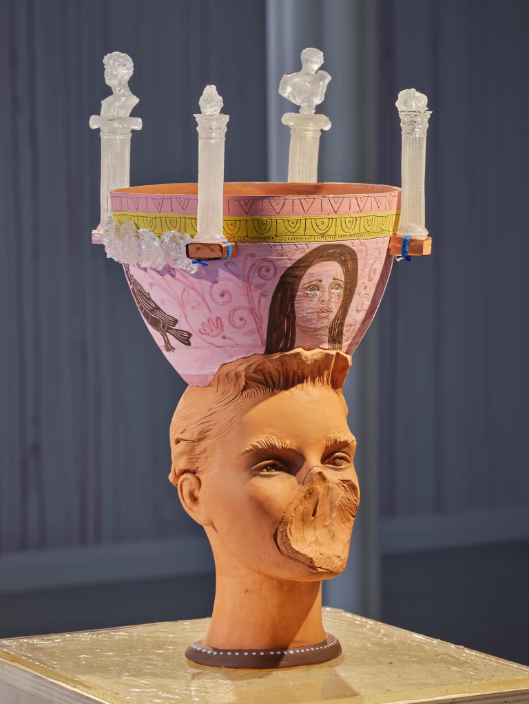 Placed at the entrance to the main gallery is a large collection of Greco-Roman-style busts, heads and mythological figurines, any one of which could be the subject of an extensive analysis. One exemplary piece, Arab Spring – After Eugène Delacroix, consists of a head ornamented by a Grecian urn. It’s notable for its disfigurement, which gives the impression of an ancient sculpture marred by time and use, while also cleverly suggesting the design of a pandemic-era face mask (a motif that recurs in various places).